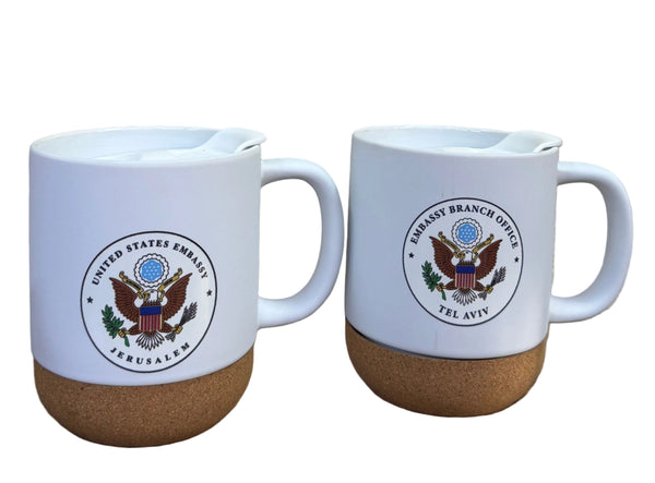 White Ceramic Mug w/ Cork Bottom - Embassy Seal